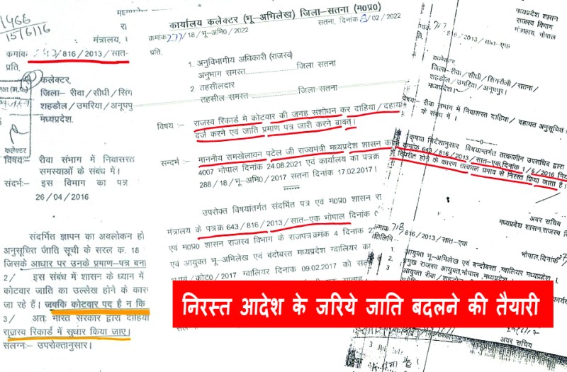 सतना. राजस्व विभाग जिस आदेश को निरस्त कर चुका है, चार साल पुराने उस निरस्त किये जा चुके आदेश का हवाला देकर अब भू-अभिलेख विभाग से जाति बदलने की तैयारी प्रारंभ कर दी गई है। इस संबंध में सभी अनुविभागीय अधिकारी राजस्व और तहसीलदारों को पत्र लिख कर निर्देशित किया गया है कि राजस्व रिकार्ड में कोटवार की जगह संशोधन कर दाहिया या दहायत दर्ज कर जाति प्रमाण पत्र जारी किए जाएं। यह पूरी कवायद राज्यमंत्री रामखेलावन पटेल के एक पत्र के बाद की गई है।