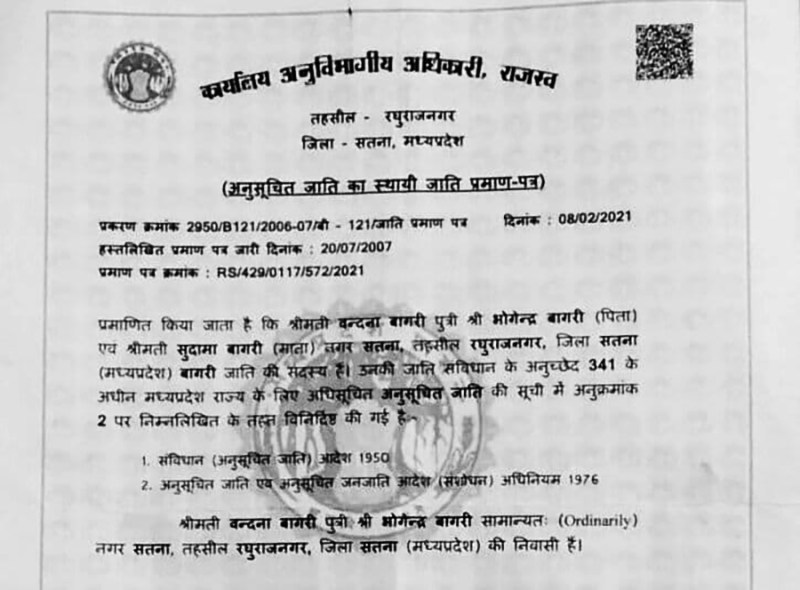 जानकारी के अनुसार वंदना बागरी को जो अनुसूचित जाति का प्रमाण पत्र बनाया गया है उसमें वंदना बागरी पुत्री भोगेन्द्र बागरी (पिता) एवं सुदामा बागरी (माता) नगर सतना तहसील रघुराजनगर जिला सतना मध्यप्रदेश बागरी जाति की सदस्य बताया गया है। जबकि भोगेन्द्र बागरी का मूल निवास सिवनी जिले में है। इसके साथ ही राज्य शासन की उच्च स्तरीय जांच कमेटी ने भी यह स्पष्ट किया हुआ है कि सिवनी जिले के बागरी अनुसूचित जाति में नहीं आते हैं। इस मामले को सदस्य संचालक आदिम जाति अनुसंधान जाति विषय विशेषज्ञ संस्था म.प्र. भोपाल एवं सचिव अनुसूचित जाति आयोग म.प्र. शासन भी यह स्पष्ट कर चुके है। पुलिस अधीक्षक सिवनी ने 23 जुलाई 2018 को अपने जांच प्रतिवेदन में भी स्पष्ट रूप से लिखा है कि सिवनी जिले में निवासरत बागड़ी/बागरी जाति अश्यपृश्यता से ग्रसित नहीं है। उन्हें अनुसूचित जाति की सुविधाएं प्रदान करने का कोई औचित्य नहीं है। आदिम जाति एवं अनुसूचित जाति कल्याण विभाग के पत्र क्रमांक एफ 23-55/98/25/04 भोपाल 14 जुलाई 2003 में भी इस बात को स्पष्ट किया जा चुका है। लिहाजा इस आधार पर वंदना बागरी का रघुराजनगर तहसील से जारी किया गया अनुसूचित जाति का जाति प्रमाण पत्र अब सवालों में घिर गया है।