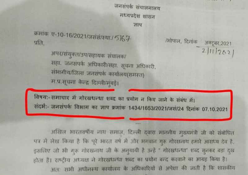 सतना। अब मध्यप्रदेश के शासकीय अभिलेखों में 'गोरखधंधा' शब्द प्रतिबंधित हो जाए तो कोई बड़ी बात नहीं होगी, क्योंकि सरकार ने इसकी शुरुआत सरकारी समाचारों से कर दी है। जनसंपर्क विभाग के समाचारों में अब 'गोरखधंधा' शब्द का प्रयोग नहीं किया जाएगा। इस संबंध में जनसंपर्क संचालनालय ने आदेश जारी कर दिये हैं। मामला मुख्यमंत्री को नाथ संप्रदाय के अनुयायियों द्वारा लिखे गये पत्र से जुड़ा है।
