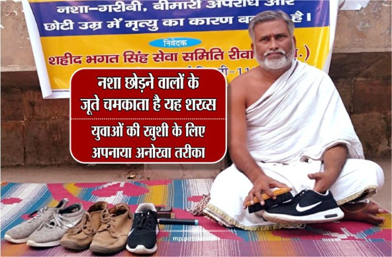 नशा छोडिय़े, फ्री में -बूट पॉलिश करवाईये। गरीबी, बीमारी और अपराध को भगाईये।। बचा लो जीवन यही है नारा, नशा मुक्त हो देश हमारा। जिंदगी की तलाश में हम मौत के कितने करीब आ गये।। नशा-गरीबी, बीमारी अपराध और छोटी उम्र में मृत्यु का कारण बनता है। इन सभी बुराईयों से दूर रहने के लिए रीवा निवासी सुजीत द्विवेदी लक्ष्मी नगर की गलियों में फुटपाथ के किनारे बैठकर -बूट पॉलिश अभियान छेड़ दिया है। नशा मुक्ति का संकल्प दिलाने के लिए सुजीत सभी प्रकार के जूतों को साफ करते है। फिर चाहे वह चमड़े का जूता हो अथवा स्पोट्स सूज सबको विधिवत साफ करते है।