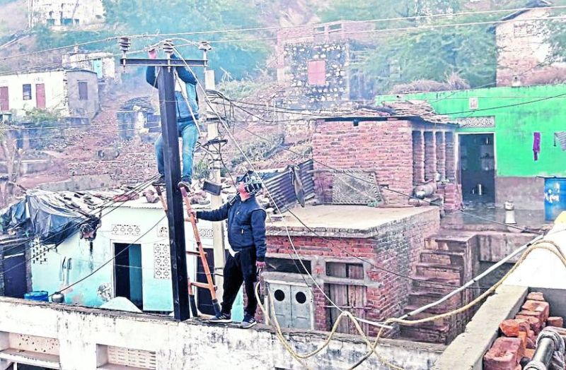 शहर के फकीर मोहल्ले में टूटे तार को जोड़ते निगम कर्मचारी।