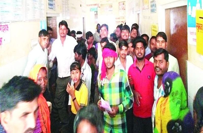 खण्डार सीएचसी परिसर में हंगामा करते हुए ग्रामीण ।