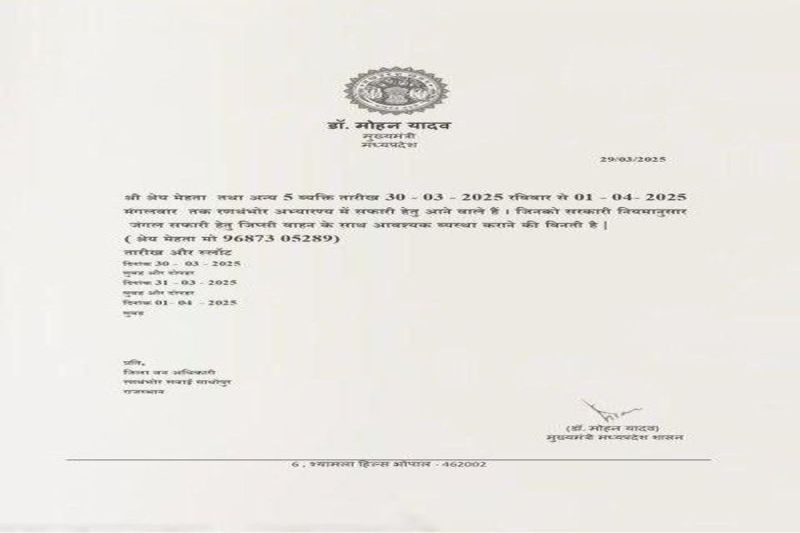 कोतवाली थानाधिकारी हरलाल सिंह मीणा ने बताया कि वन विभाग की ओर से पूरे घटनाक्रम को लेकर एक रिपोर्ट दर्ज कराई है। जिसमें वनाधिकारियों ने बताया कि अहमदाबाद का श्रेय मेहता अपने पांच दोस्तों के साथ रणथम्भौर टाइगर रिजर्व घूमने आया था। श्रेय मेहता ने जिप्सी के लिए मध्यप्रदेश के मुख्यमंत्री डॉ. मोहन यादव के लेटरपेड पर हस्ताक्षरयुक्त एक पत्र वन विभाग को मेल किया। जिस पर वन विभाग को शक हुआ तो पत्र की पड़ताल की। प्रदेश के सीएमओ स्तर पर जांच हुई तो फर्जीवाड़े का खुलासा हुआ। जिसपर वन विभाग की ओर से सवाईमाधोपुर कोतवाली में सोमवार सुबह मामला दर्ज कराया गया। मामला दर्ज होने पर पुलिस ने रणथम्भौर की एक होटल से अहमदाबाद निवासी श्रेय मेहता पुत्र मुकेश मेहता को डिटेन किया है। कोतवाली थानाधिकारी मीणा ने बताया कि फिलहाल पुलिस मामले की जांच कर रही है। जिसके बाद अग्रिम कार्रवाई की जाएगी।