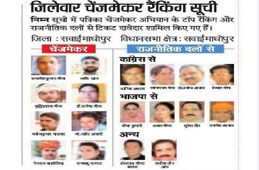 चेंजमेकर अभियान :सवाईमाधोपुर में ये हैं संभावित दावेदारों के चेहरे, विस्तृत खबरों और फोटोग्राफ्स के लिए देखे..rajasthanpatrika.com