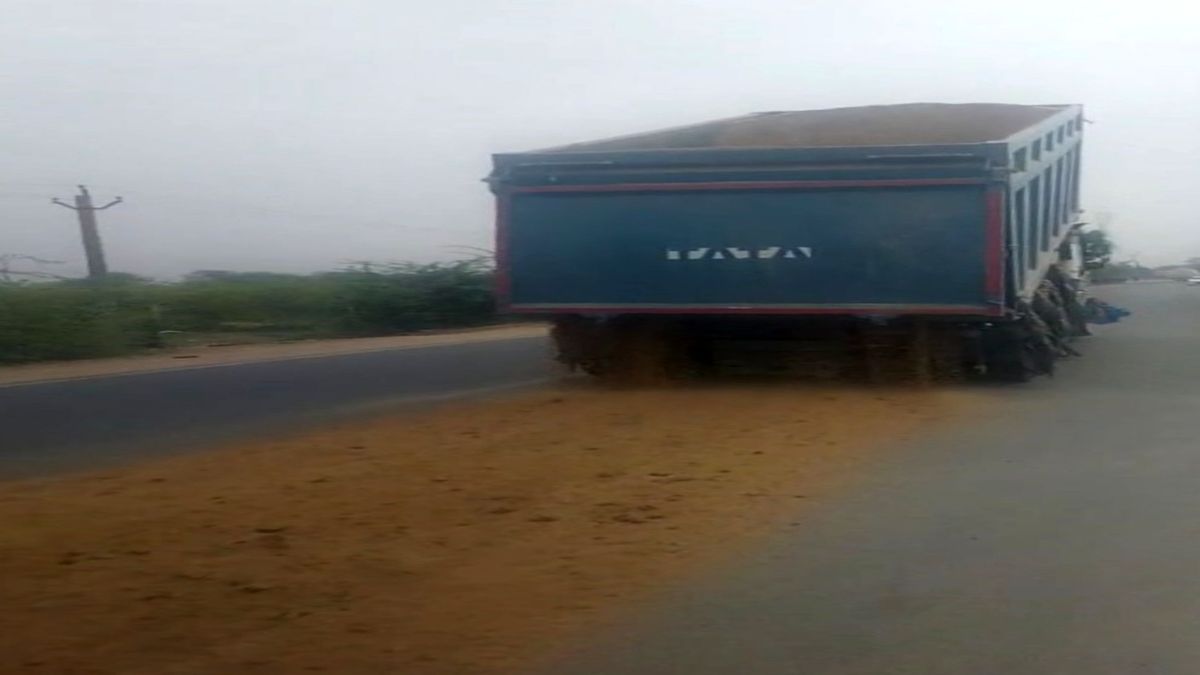 सवाईमाधोपुर. पीछा कर रही पुलिस को रोकने के लिए कोटा-लालसोट मेगा हाइवे पर चलते हुए बजरी खाली करता डंपर चालक।