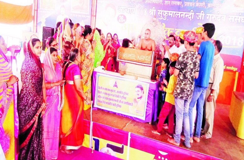 सवाईमाधोपुर के आलनपुर स्थित चमत्कारजैन मंदिर में सुकुमालनंदी की वंदना कर आशीर्वाद प्राप्त करते श्रद्धालु।