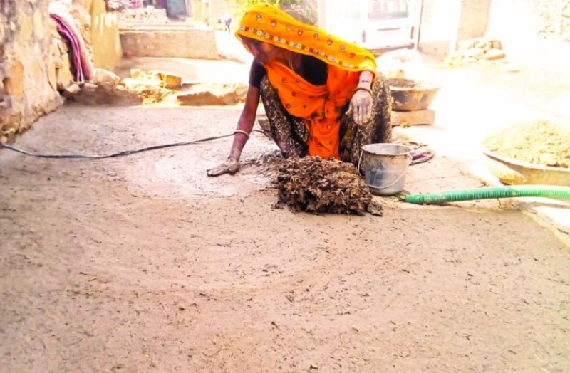 रवांजना चौड़ में चबूतरे पर मिट्टी का घारा लगा कर लिपाई करती महिला।