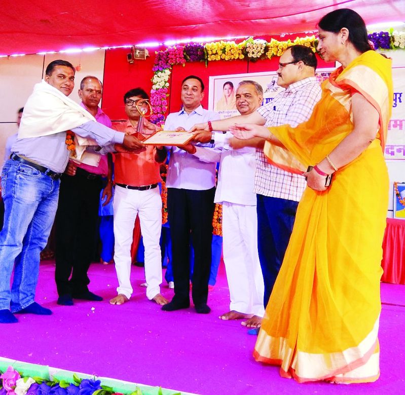 सवाईमाधोपुर जिला स्तरीय सम्मान समारोह में शिक्षक को सम्मानित करते कलक्टर व अन्य तथा सम्मानित शिक्षिका।