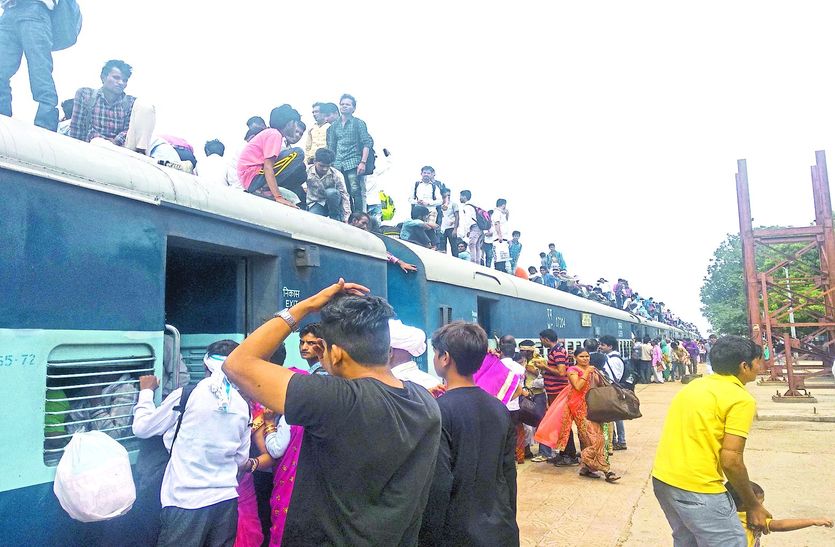 चौथकाबरवाड़ा. राखी के त्योहार घर पहुंचने की जल्दी में लोग जान जोखिम में डालकर ट्रेनों व बसों में सफर कर रहे हैं। राखी का त्योहार होने के कारण शनिवार को ट्रेनों में काफी भीड़ रही। यात्रियों को ट्रेन की छतों पर बैठ कर यात्रा करनी पड़ी। शनिवार को जयपुर-बयाना ट्रेन में काफी भीड़ होने से ट्रेन की गति धीमी रही। कई स्टेशनों पर चेन पुलिंग होने के कारण चौथ का बरवाड़ा रेलवे स्टेशन पर करीब दो घंटे की देरी देरी से पहुंची। भीड को देखते हुए स्टेशन पर कई यात्री ट्रेन में नहीं चढ़ सके।