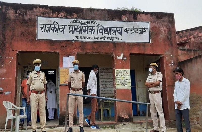 बामनवास. जाहिरा के मतदान केन्द्र पर नामांकन प्रक्रिया के दौरान तैनात पुलिसकर्मी।