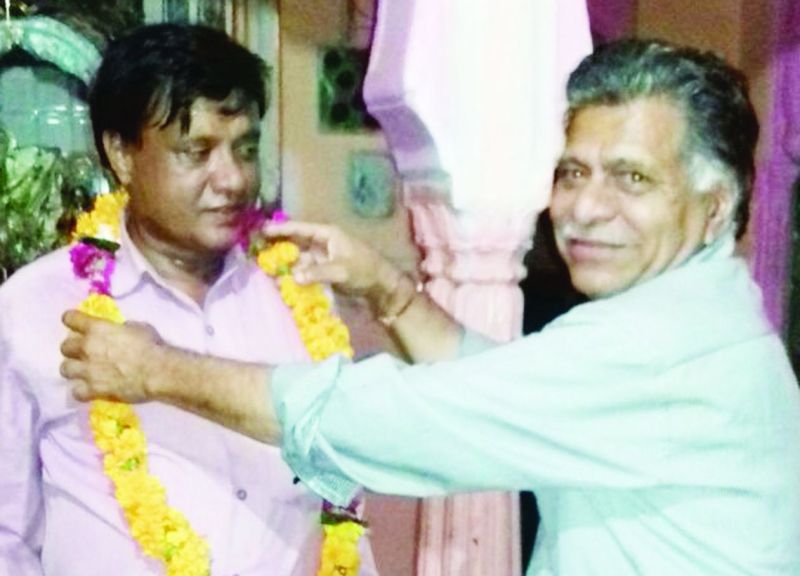 शहर के अग्रवाल स्कूल में हुए चुनावों में विजयी अध्यक्ष को माला पहनाते समाज के लोग।