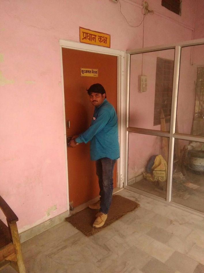 प्रधान कक्ष के ताला लगाते उप प्रधान बसंतीलाल मीणा।