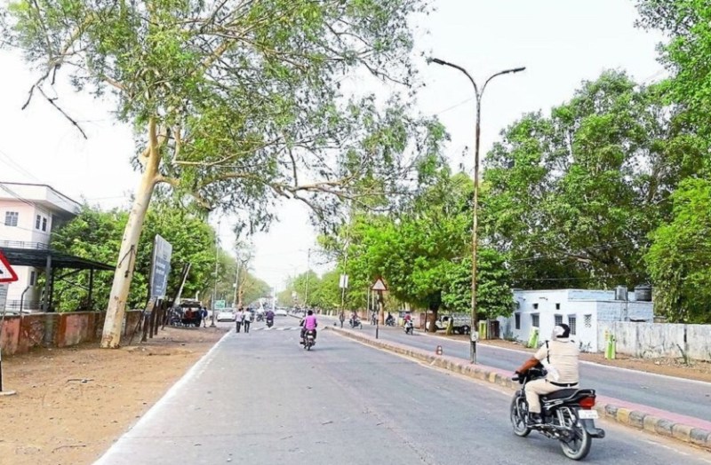 कलक्ट्रेट रोड पर शाम पांच बजे तेज हवा के बीच गुजरते लोग।