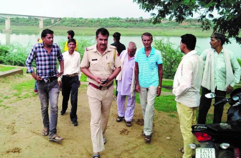 पाली ब्रिज के पास चम्बल में युवक की तलाश के लिए पुलिस और रेस्क्यू टीम के लोग।