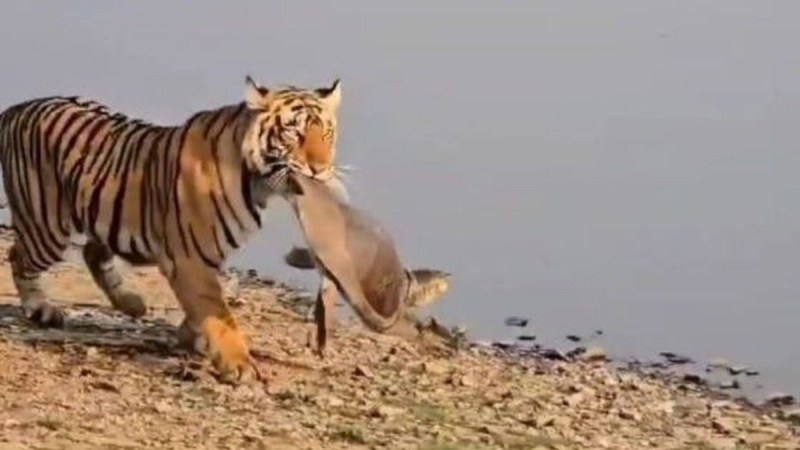 रणथम्भौर टाइगर रिजर्व के जोन तीन में शाम की पारी में जोन तीन स्थित एक पानी के तालाब के बाहर एक कछुआ धूप सेक रहा था। तभी अचानक वहां पर बाघिन एरोहैड की बेटी रिद्धी यानि टी-124 आ गई। बाघिन ने अचानक ही कछुए पर हमला कर दिया और कछुए को अपना शिकार बना लिया। बाघिन को कछुए का शिकार करते देख पर्यटक रोमांचित हो उठे और उन्होंने इस नजारे को कैमरे में कैद किया।
