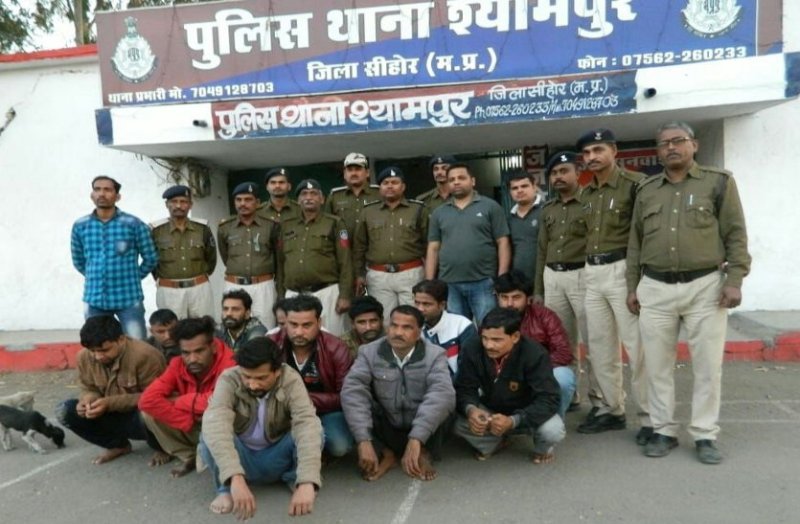 श्यामपुर पुलिस ने पिपलानी भोपाल निवासी 35 वर्षीय लाखन सिंह पिता हरि सिंह राजपूत, गौतम नगर भोपाल निवासी 34 वर्षीय मेहबूब शेख पुत्र शेख सुसूब, श्यामपुर निवासी 32 वर्षीय बालकिशन माली पुत्र घीसीलाल माली, लोधीन नगर चन्दन नगर विदिशा रोड थाना छोला भोपाल निवासी 38 वर्षीय राघवेन्द्र सिंह सिंह ठाकुर पुत्र राजाबाबू ठाकुर, अशोका गार्डन भोपाल निवासी 42 वर्षीय पवन जैन पिता राजकुमार जैन, रेहटी निवासी 33 वर्षीय संतोष मेहता, अटल नेहरू महेन्द्र गैरेज के सामने भानपुर भोपाल निवासी 25 वर्षीय कन्हैया लोधी पुत्र श्यामबाबू लोधी, अन्नपूर्णा नगर कुरावर निवासी 28 वर्षीय जितेन्द्र खाती पुत्र गोविन्द्र प्रसाद, झाडला कुरावर निवासी 51 वर्षीय हरिनारायण पिता मांगीलाल भिलाला, मंडीदीप थाने पीछे निवासी 37 वर्षीय संजय पाल पिता ताराचन्द्र पाल, प्रेमनगर थाना मण्डीदीप निवासी 28 साल चंदन मालवीय पिता विजय मालवीय, झाड़ला कुरावर निवासी 33 वर्षीय राकेश दांगी पिता मांगीलाल दांगी, श्यामपुर निवासी 32 वर्षीय मनोज भाटी पुत्र सत्यनारायण भाटी, श्यामपुर निवासी अकरम कुरैशी पुत्र मजीद खां, कुरावर निवासी रामसिंह खाती को जुआ खेलते दबोचा है।
