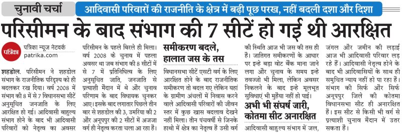 शहडोल. परिसीमन ने शहडोल संभाग के राजनीतिक परिदृश्य को ही बदलकर रख दिया। वर्ष 2008 में संभाग की 8 में से 7 विधानसभा सीटें अनुसूचित जनजाति के लिए आरक्षित हो गई। आदिवासी बाहुल्य संभाग होने के बाद भी आदिवासी परिवारों को नेतृत्व का अवसर परिसीमन के पहले बिरले ही मिला। वर्ष 2008 के चुनाव में पहला अवसर था जब संभाग की 8 सीटों में से 7 में प्रतिनिधित्व के लिए अनुसूचित जाति, जनजाति से प्रत्याशी मैदान में थे और चुनाव परिणाम के बाद विधायक चुनकर आए। इसके बाद लगातार पिछले तीन बार से शहडोल की 3, उमरिया की 2 और अनूपपुर की 2 सीटों में अजजा वर्ग ही नेतृत्व करता चला आ रहा है।