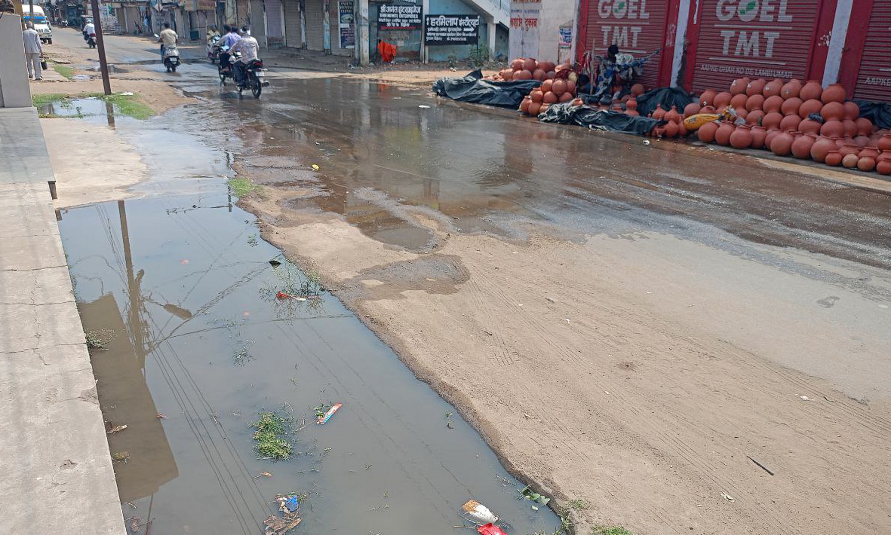 इंदिरा चौक के समीप बस स्टैंड मार्ग में इन दिनों चंदिया से छोटे-छोटे व्यापारी आकर मटके की दुकान लगाए हुए हैं। मटका बेचकर अपने परिवार का गुजर बसर कर रहे हैं। लेकिन नाली का गंदा पानी इनकी दुकानों में घुस रहा है। जिसके कारण मिट्टी से बने बर्तनों को नुकसान हो रहा है। दुकानदारों ने बताया कि बीते एक सप्ताह से लगातार पानी भरने से परेशानियों का सामना करना पड़ रहा है। वहीं व्यापार भी प्रभावित हो रहा। इसके साथ ही आसपास के दुकान दार नाली के दुर्गन्ध से परेशान हैं। दुकानदारों नें बताया कि नगरपालिका इस क्षेत्र में बनी नालियों की सफाई कभी कभार ही करती है। यहीं कारण है पूरी नाली चोक हो चुकी है।