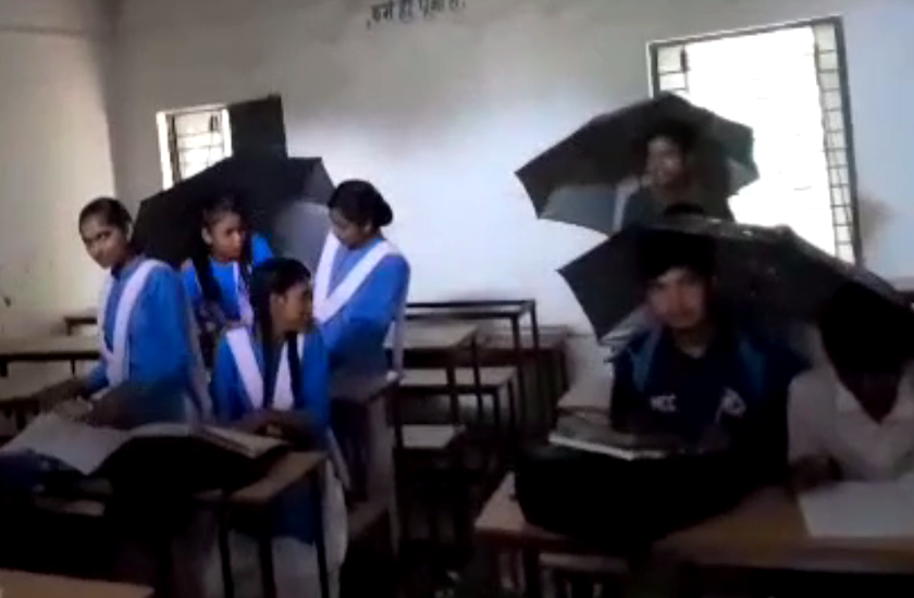 क्लासरूम में छाता लगाकर बैठने पर हो पाती है पढ़ाई