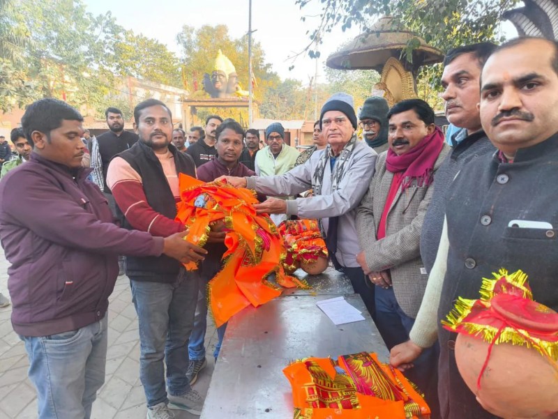 कार्यकर्ताओं को हिंदू सम्मेलन का धर्म ध्वज एवं अक्षत कलश का वितरण किया गया