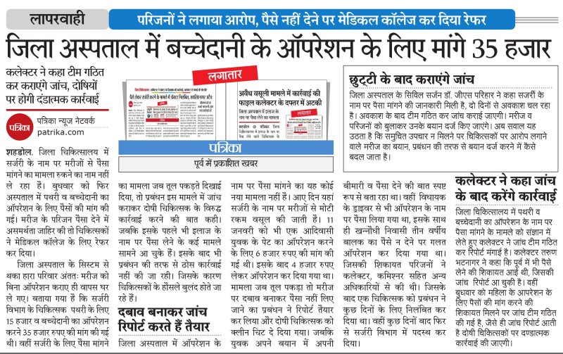 जिला अस्पताल के सिविल सर्जन डॉ. जीएस परिहार ने कहा सजर्री के नाम पर पैसा मांगने की जानकारी मिली है, दो दिनों से अवकाश चल रहा है। अवकाश के बाद टीम गठित कर जांच कराई जाएगी। मरीज व परिजनों को बुलाकर उनके बयान दर्ज किए जाएंगे। अब सवाल यह उठता है कि समुचित उपचार न मिलने पर चिकित्सकों पर आरोप लगाने वाले मरीज का बयान, प्रबंधन की तरफ से बयान दर्ज करने में कैसे बदल जाता है।