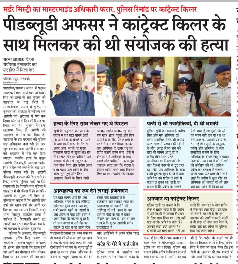 हत्याकाण्ड मामले में गिरफ्तार एक आरोपी से पूछताछ और जांच के दौरान कई तथ्य सामने आ रहे हैं। दोनों आरोपी हत्या के बाद उमरिया पहुंचे थे। जहां पर चिल्हारी स्थित एक घर में ठहरे थे। इसके बाद आरोपी पीडब्लूडी अफसर प्रदीप सिंह शहडोल आया था। शहडोल पहुंचते ही एक ठेकेदार को दूसरे के मोबाइल से फोन किया था। शहडोल पहुंचने के बाद १५ अगस्त के बाद से आरोपी अंडरग्राउंड हो गया था। हत्याकाण्ड के खुलासे के बाद पुलिस ने शहडोल निवासी एक आरोपी शेर खान उर्फ शेरू को गिरफ्तार कर लिया है लेकिन मुख्य आरोपी पीडब्लूडी के सेतु निर्माण विभाग के एसडीओ प्रदीप सिंह का सुराग नहीं मिला है। सतना पुलिस शहडोल के अलावा अन्य ठीहों पर दबिश दे रही है लेकिन कोई सुराग नहीं मिला है। विभागीय सूत्रों की मानें तो ठेकेदारी से जुड़े दो बड़े मंत्रियों के साथ आरोपी प्रदीप का अच्छा खासा संबंध भी है।