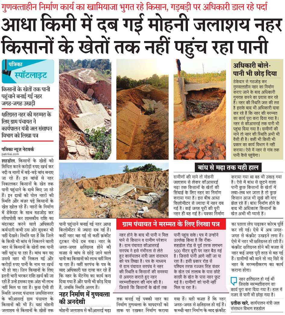 शहडोल. मोहनी जलाशय से किसानों के खेतों की प्यास बुझाने के लिए बनाई गई नहर तकनीकी खामियों की भेंट चढ़ गई। नहर निर्माण में न तो गुणवत्तायुक्त सामग्री का उपयोग किया गया और न ही तय मापदण्डों का पालन किया गया।विभागीय अधिकारियों की अनदेखी व ठेकेदार की लापरवाही का खामियाजा उन किसानों को भुगतना पड़ रहा है जो कि यह आस लगाए बैठे थे कि बांध से उनके खेतों तक पानी पहुंचेगा और वह खेती कर सकेंगे। बांध भी बन गया नहर भी बन गई लेकिन खेतों तक पानी पहुंचने के पहले ही नहर कहीं दब गई तो कहीं नहर का पूरा हिस्सा ही बह गया। पानी के अभाव में किसानों के सूख रहे खेतों को देखकर ग्राम पंचायत ने चिंता जताई और विभाग को पत्राचार कर मेंटेनेंस की मांग की। पहले तो अधिकारियों ने ठेकेदार से गठजोड़ कर नहर निर्माण में लीपापोती की और अब जब कारनामा उजागर हुआ तो उसमें पर्दा डालने लीपापोती करने का प्रयास कर रहे हैं। नहर का मेंटीनेंस हुआ नहीं और अधिकारी कौआसरई तक पानी पहुंचाने का दावा कर रहे हैं। जबकि ग्रामीणों की माने तो नहर की स्थिति जस की तस है।