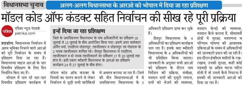 जिले के जयसिंहनगर विधानसभा के पांच अधिकारियों का प्रशिक्षण 10 जुलाई से 13 जुलाई के बीच आयोजित किया गया। इसमें अपर कलेक्टर अर्पित वर्मा, एसडीएम सोहागपुर, तहसीलदार व सोहागपुर एवं गोहपारू के 2 नायब तहसीलदार शामिल रहे। जैतपुर विधानसभा से एसडीएम, तहसीलदार व दो नायब तहसीलदारों का प्रशिक्षण 17 से 20 जुलाई तक होना है। इसी प्रकार ब्यौहारी विधानसभा के आरओ का प्रशिक्षण कार्यक्रम 24 से 27 जुलाई के बीच होगा।