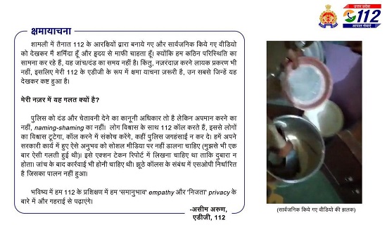 साथ ही लिखा गया है, पुलिस को दंड और चेतावनी देने का कानूनी अधिकार तो है लेकिन अपमान करने का नहीं। लोग विश्वास के साथ 112 पर कॉल करते हैं। इससे लोगों का विश्वास टूटेगा। हमें अपने सरकारी कार्य में हुए ऐसे अनुभव को सोशल मीडिया पर नहीं डालना चाहिए। इसे एक्शन टेकेन रिपोर्ट में लिखना चाहिए था। अगर दोबारा होता तो जांच के आद कार्रवाई होती। झूठे कॉल्स के संबंध में एसओपी निर्धारित है जिसका पालन नहीं हुआ। भविष्य में हम 112 के प्रशिक्षण में समानुभाव एंपैथी और निजता प्राइवेसी के बारे में और गहराई से पढ़ाएंगे।