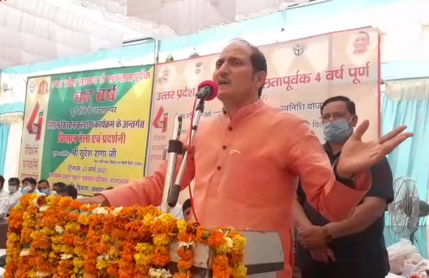 शामली की थानाभवन नगर पंचायत में मिशन किसान कल्याण कार्यक्रम के तहत किसान मेला एवं प्रदर्शनी का आयोजन किया गया था, जिसमें कृषि विभाग से संबंधित अधिकारियों व जनपद के एडीएम और सीडीओ मौजूद रहे। कार्यक्रम में पहुंचे किसानों को गन्ना मंत्री ने संबोधित करते हुए कहा कि जो लोग पिछली सरकारों में शुगर मिल बेच देते थे, वह भी हमसे हिसाब मांग रहे हैं। उन्होंने मंच से बोलते हुए कहा कि कोरोना काल में जब तक आखरी गन्ना मिल में नहीं गया, सरकार ने गन्ना मिल भी बंद नहीं होने दीं। उन्होंने कहा कि सपा सरकार के शासनकाल का बकाया गन्ना भुगतान योगी सरकार ने कराया था, ऐसे लोग भी गन्ना भुगतान को लेकर हम से सवाल पूछते हैं।