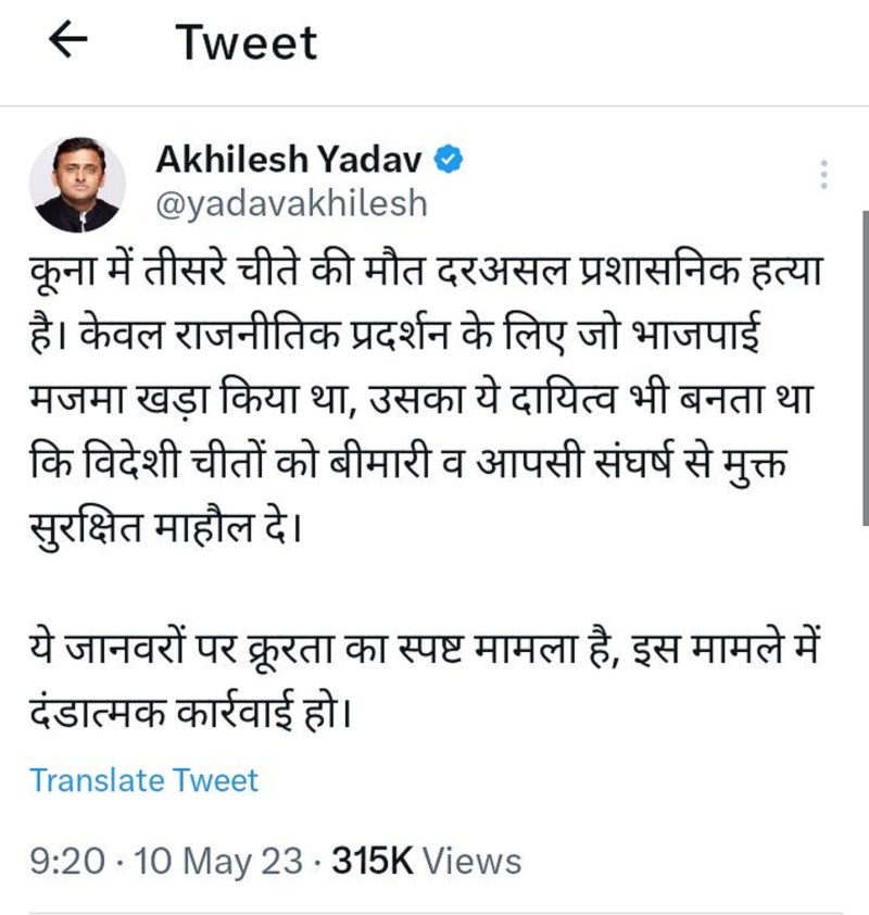 कूनो में हुई तीसरे चीते की मौत के मामले में समाजवादी पार्टी के राष्ट्रीय अध्यक्ष अखिलेश यादव ने ट्वीट कर इसे प्रशासनिक हत्या करार दिया है।