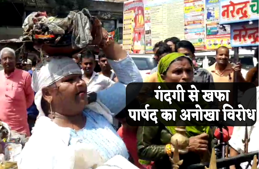 सफाई न होने से खफा महिला पार्षद का अनोखा प्रदर्शन, सिर पर कचरा रखकर लाईं और CMO के गेट पर फैला दिया, वीडियो वायरल