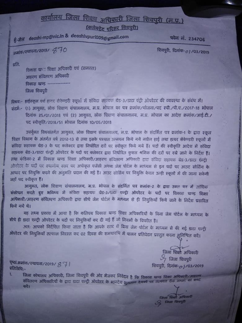 शिवपुरी. शिक्षा विभाग में हाईस्कूल व हायर सेकंडरी स्कूलों में जैम पोर्टल के माध्यम से संविदा आधार पर डाटा एंट्री ऑपरेटर की नियुक्तियां की जानी थीं, परंतु महकमे ने जैम पोर्टल पर रिक्वेस्ट डाले बिना ही बाला-बाला ऐशकॉम मीडिया इंडिया प्रायवेट लिमिटेड से सांठगांठ कर जिले भर में संविदा आधार पर डाटा एंट्री ऑपरेटर्स की नियुक्तियां कर दीं।