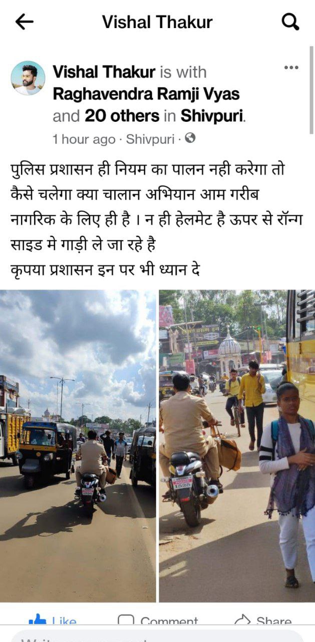 जानकारी के मुताबिक शहरवासी विशाल ठाकुर ने सोशल मीडिया पर पोस्ट की थी कि हेलमेट अभियान सिर्फ गरीबों के लिए है, पुलिस के लिए यह नियम लागू नही होते। इस पोस्ट के वायरल होने की जानकारी यातायात प्रभारी रणवीर यादव को मिली तो उन्होने पोस्ट में दिख रही बाइक नंबर से जानकारी ली तो बाइक पुलिस लाइन में पदस्थ आरक्षक बदन सिंह धाकड़ के नाम पर मिली। इस पर से ट्रेफिक प्रभारी यादव ने आरक्षक पर २५० रुपए का ऑनलाइन चालान किया है। प्रभारी का कहना है कि नियम सभी के लिए है। हमने कई पुलिसकर्मियों के चालान किए है।