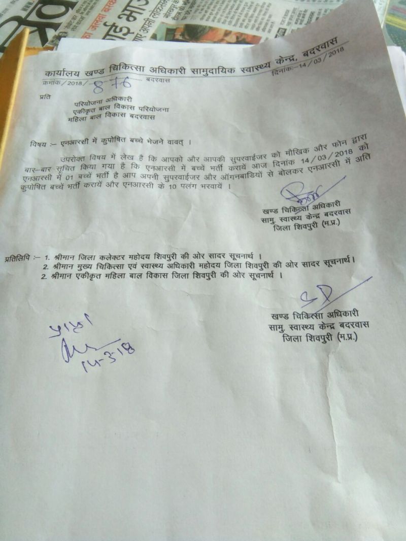 जानकारी के मुताबिक बदरवास विकासखंड में करीब 38 हजार सहरिया तथा इतनी ही आबादी जाटव समुदाय की है। इनके परिवारों में कुपोषित बच्चों की संख्या काफी ज्यादा है। इन बच्चों को पोषण पुनर्वास केंद्र तक पहुंचाने की पहली जिम्मेदारी महिला बाल विकास विभाग एवं स्वास्थ्य विभाग के मैदानी अमले की है। लेकिन इन विभागों के अधिकारी एक दूसरे को पत्र व्यवहार कर ही अपने कर्तव्य की इतिश्री मान रहे हैं।