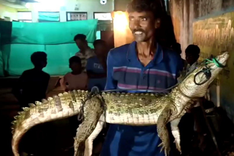 करौंदी क्षेत्र में निकला मगरमच्छ, युवक गोद में लेकर घूमता दिखा (Photo Source- Patrika)