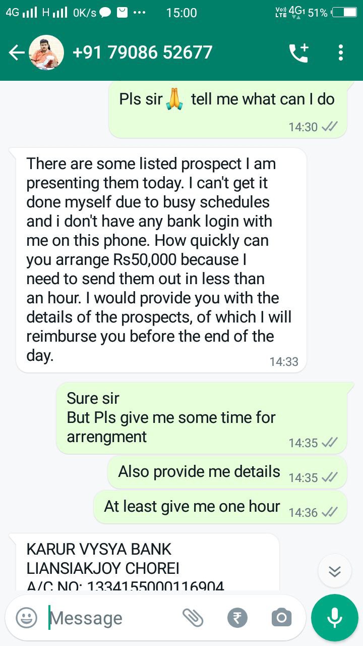 मंगलवार को कलेक्टर का फोटो लगाकर मोबाइल नंबर 7908652677 के वाट््सअप से उद्योग विभाग के एक अधिकारी को मैसेज भेजा गया। यह मैसेज इंग्लिश में लिखा गया, जिसमें उसने कलेक्टर बनकर 50 हजार रुपए की मांग की। चूंकि इस अधिकारी के पास कलेक्टर का नंबर सेव है तथा उसे यह भी पता है कि जिलाधीश कौन से नंबर पर वाट््सअप चलाते हैं, तो उसने बिना देर किए कलेक्टर से संपर्क किया और मैसेज बताया,। कलेक्टर ने जब अपना फोटो व उस मैसेज को देखा, तो वे हतप्रभ रह गए कि सोशल मीडिया के माध्यम से किस तरह लोग ठगी करने पर उतारू हो गए हैं।