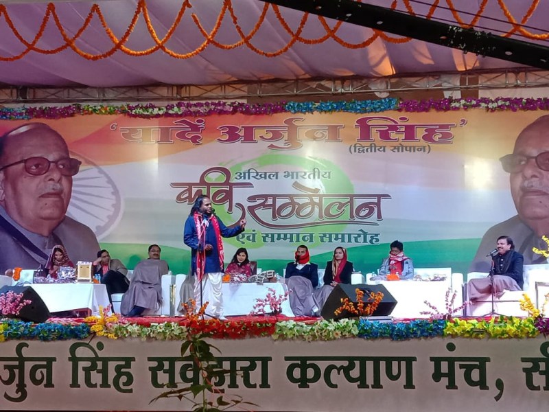 सीधी। पूर्व केंद्रीय मानव संसाधन विकास मंत्री एवं मप्र के मुख्यमंत्री रहे स्व.कुंवर अर्जुन सिंह की याद में शनिवार की शाम शहर के छत्रसाल स्टेडियम में यादें अर्जुन सिंह अखिल भारतीय कवि स मेलन द्वितीय सोपान का स्थानीय छत्रसाल स्टेडियम में सम्मान समारोह एवं अखिल भारतीय विराट कवि सम्मेलन का आयोजन किया गया। कार्यक्रम में बतौर मुख्य अतिथि मप्र सरकार के पर्यटन मंत्री सुरेंद्र सिंह बघेल उपस्थित रहे, जबकि कार्यक्रम की अध्यक्षता मप्र विधानसभा के पूर्व नेता प्रतिपक्ष अजय ङ्क्षसह राहुल ने की। इस अवसर पर देश भर के आये ख्यातिलब्ध कवियों ने देर रात तक अपने कविता पाठों के माध्यम से श्रोताओ बांधे रखा। कवि सम्मेलन में भाग लेने वाले कवियों में मुख्य रूप से गजेंद्र सोलंकी दिल्ली, अशोक सुंदरानी सतना, हासिम फिरोजाबादी उप्र, शंभू शिखर बिहार, मुमताज नसीम दिल्ली, राधाकांत पांडेय दिल्ली, अखिलेश द्विवेदी प्रयागराज, अनिल चौबे बनारस, साक्षी तिवारी प्रयागराज व विजयलक्ष्मी शुक्ला सिंगरौली शामिल रहे।