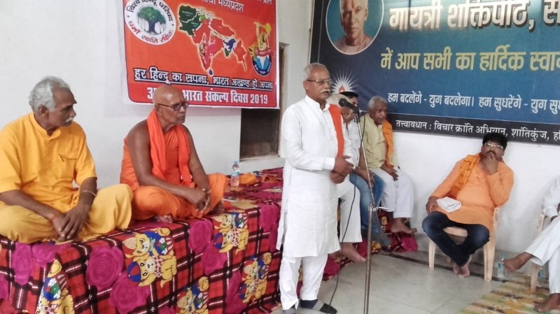 अखंड भारत संकल्प दिवस के मुख्य अतिथि पूज्य संत स्वामी परमानंद महाराज धर्म समन्वयक विभाग संयोजक विश्व हिंदू परिषद् रीवा विभाग, अध्यक्षता विहिप के जिलाध्यक्ष रामराज शुक्ला तथा मुख्य वक्ता विश्व हिंदू परिषद महाकौशल प्रांत के प्रांत सह मंत्री सागर गुप्ता रहे। कार्यक्रम के शुभारंभ में भगवान श्रीरामचंद्र जी का दरबार, भारत माता की प्रतिमा तथा गायत्री माता की दिव्य प्रतिमा पर आमंत्रित अतिथियों द्वारा दीप प्रज्जवल एवं पुष्प अर्पण कर कार्यक्रम का शुभारंभ किया गया। तदोपरांत गणेश वंदना, तीन बार प्रणवोच्चार, एकात्मता मंत्र, विजय महामंत्र 13 बार श्रीराम जय राम जय जय राम के साथ सात बार सामूहिक रूप से उपस्थित जन समुदाय द्वारा हनुमान चालीसा का पाठ किया गया। कार्यक्रम में अतिथियों का स्वागत विश्व हिंदू परिषद के कोषाध्यक्ष राजेंद्र सोनी जिला मठ मंदिर प्रमुख गोरेंद्रधर द्विवेदी द्वारा श्रीराम नामी गम्छे से स्वागत किया गया। इस अवसर पर स्वामी परमानंद महाराज ने कहा कि भारत की एकता और अखंडता को कायम रखने की जिम्मेदारी संपूर्ण हिंदू समाज की है। अखंड भारत को खंडित करने का कुचक्र चाल कुछ राजनैतिक व्यक्तिगत चाल स्वार्थ के कारण अलग-अलग हिस्सों में आजादी के पहले बांट दिया गया। हिंदुस्तान सनातन संस्कृत का परिचायक है, और हिंदू राष्ट हजारों वर्ष पहले ही हिंदुत्व का उदय हुआ था, इसके बाद स्लाम का उदय हुआ। भारत वर्ष में कोई भी वर्तमान के मुसलमान मुसलमान नहीं है, वे सभी पूर्व के हिंदू वंशज हैं। हिंदुस्तान पूरे देश का आज भी मार्गदर्शन करता है और करता रहेगा। मुख्य वक्ता के रूप में उपस्थित सागर गुप्ता ने कहा कि भारत के विभाजन से हमारे कई अभिन्न अंग, बंग्लादेश, पाकिस्तान, पीओके, भारत के अभिन्न अंग थे, इन्हें एक सूत्र में पिरोने का कार्य संतो के मार्गदशन में विश्व हिंदू परिषद कर रहा है। बंटवारे के समय तत्कालीन प्रधानमंत्री 24 प्रतिशत मुस्लिम आबादी के लिए 29 प्रतिशत भू-भाग मुस्लिम तुष्टिकरण के कारण दे दिया गया था यह देश का दुर्भाग्य था। असल में जो स्वतंत्रता के समय भगत सिंह, राजगुरू, चंद्रसेखर आजाद जैसे क्रांतिकारियों ने जो सपना देखा था उस सपने का वर्तमान सरकार ने धारा 370, 35ए को समाप्त कर भारत के सिरमौक उज्वलित किया है। भगवान श्रीराम के भव्य मंदिर का निर्माण 2020 में चाहे फैसला जो भी हो पक्ष में होगा तो स्वागत नहीं तो संसद में कानून बनाकर अयोध्या में भगवान रामलला विराजमान होंगे। कार्यक्रम के अंत में जिला मंत्री पुजेरीलाल मिश्र के साथ अध्यक्षीय उद्बोधन विहिप के जिलाध्यक्ष रामराज शुक्ला ने किया। कार्यक्रम का समापन शांति मंत्र पाठ एवं जयघोष के साथ प्रसाद वितरण कर किया। उक्त अवसर पर प्रमुख रूप से विहिप क