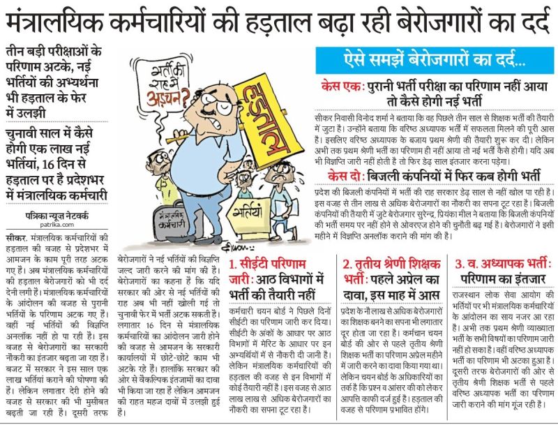 मंत्रालयिक कर्मचारियों की हड़ताल की वजह से प्रदेशभर में आमजन के काम पूरी तरह अटक गए है। अब मंत्रालयिक कर्मचारियों की हड़ताल बेरोजगारों को भी दर्द देनी लगी है। मंत्रालयिक कर्मचारियों के आंदोलन की वजह से पुरानी भर्तियों के परिणाम अटक गए है। वहीं नई भर्तियों की विज्ञप्ति अनलॉक नहीं हो पा रही है। इस वजह से बेरोजगारों का सरकारी नौकरी का इंतजार बढ़ता जा रहा है। बजट में सरकार ने इस साल एक लाख भर्तियां कराने की घोषणा की है। लेकिन लगातार देरी होने की वजह से सरकार की भी मुसीबत बढ़ती जा रही है। दूसरी तरफ बेरोजगारों ने नई भर्तियों की विज्ञप्ति जल्द जारी करने की मांग की है। बेरोजगारों का कहना है कि यदि सरकार की ओर से नई भर्तियों की राह अब भी नहीं खोली गई तो चुनावी फेर में भर्ती अटक सकती है।