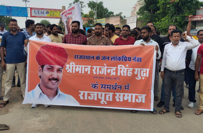 Expulsion of Rajendra Gudha enraged the Rajput community. सीकर. उदयपुरवाटी विधायक राजेंद्र सिंह गुढ़ा को मंत्री पद से बर्खास्त करने व विधानसभा में अभद्र व्यवहार करने के विरोध में राजपूत समाज ने सोमवार को बजाज सर्किल पर आक्रोश प्रदर्शित किया। इस दौरान समाज के लोगों ने जमकर नारे लगाए। प्रदर्शनकारियों का कहना था कि जगह मामले में जब तक गहलोत सरकार सार्वजनिक रूप से माफी नहीं मांगते हुए आरोपी मंत्रियों पर कार्रवाई नहीं करेगी तक तक समाज का आंदोलन जारी रहेगा। आगामी विधानसभा चुनावों में भी समाज कांग्रेस का बहिष्कार करेगा।