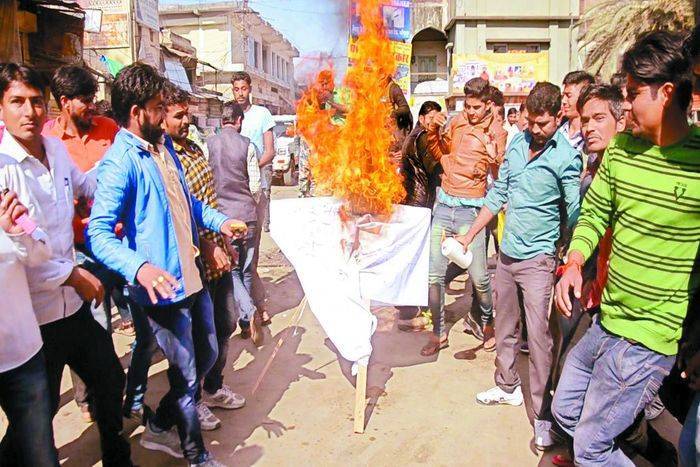 राष्ट्रीय राजपूत करणी सेना ने सोमवार को फतेहपुर में बावड़ी गेट पर फिल्म निर्माता संजय लीला भंसाली का पुतला फूंका। पुतला जलाने के लिए उस पर पेट्रोल डाल दिया गया। इस दौरान कई युवक उसके चारों तरफ खड़े थे। माचिस जलाते ही तेजी से आग भभकी और बोतल तक पहुंच गई। कई युवक आग की चपेट में आते आते बचे। पुतला दहन के दौरान विभिन्न समाजों के लोग भी साथ रहे। तहसील अध्यक्ष प्रताप सिंह नारी ने कहा कि इतिहास के साथ छेड़छाड़ बर्दाश्त नहीं की जाएगी। पद्मिनी को लेकर सर्व समाज साथ है और आंदोलन भी किया जाएगा।