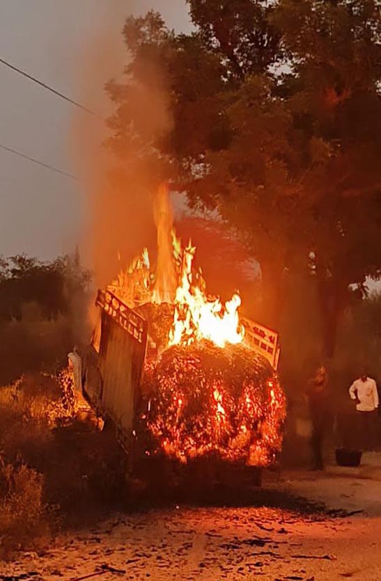 तिराहा के पास जैसे ही पिकअप में आग लगी तो चालक घबरा गया। वहां खड़े विक्रम ने पिकअप को दौड़ाते हुए चला की ढाणी की तरफ ले ेगया। इस दौरान रास्ते में जगह जगह कड़बी जलती हुई गिरती जा रही थी। रोड पर जगह-जगह जल रही कड़बी को देख लोगों में अफरा तफरी मच गई।