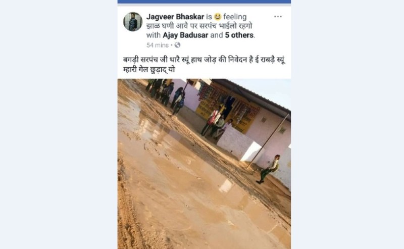 गांव राजास के जगवीर भास्कर ने 2 दिसम्बर की दोपहर को अपनी फेसबुक आईडी से पोस्ट डाली, जिसमें गांव बगड़ी में भरे गंदे पानी की फोटो के साथ फीलिंग शेयर करते हुए लिखा था कि ‘झाल घणी आवै पण सरपंच भाईलो रहग्यो’ (गंदे पानी की समस्या पर गुस्सा तो बहुत आता है, मगर क्या कर सकते हैं सरपंच दोस्त है।)