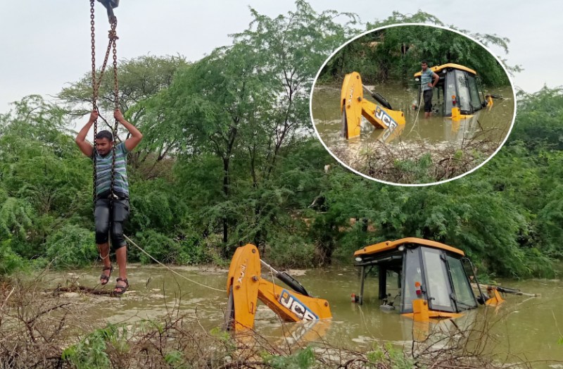 सीकर में भारी बारिश के बाद रेस्क्यू में लगी जेसीबी डूबी, दो घंटे तक अटकी रही सांसे, चालक को यूं बचाया