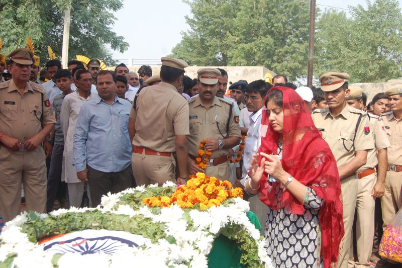 तस्वीर : शहीद जवान को श्रद्धांजलि देतीं एसडीएम व झुंझुनूं पुलिस के अधिकारी व अन्य।