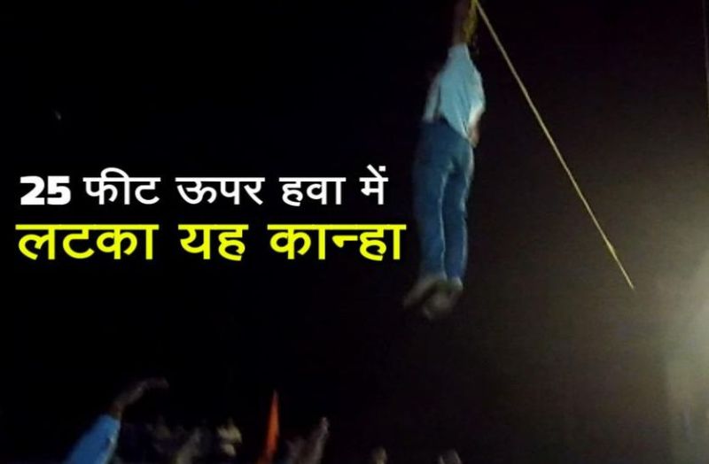 सीकर. राजस्थान के सीकर के धोद में जन्माष्टमी 2018 की रात को हुई मटकी फोड़ प्रतियोगिता में एकबारगी तो सबकी सांसे थम गई। यहां मटकी फोडऩे वाला एक ‘गोविंदा’ पिरामिड गिरने से 25 फिट ऊपर हवा में लटक गया। जिससे लोग दहशत में आ गए। कुछ देर रस्सी पर लटकने के बाद उसने जमीन पर छलांग लगा दी।