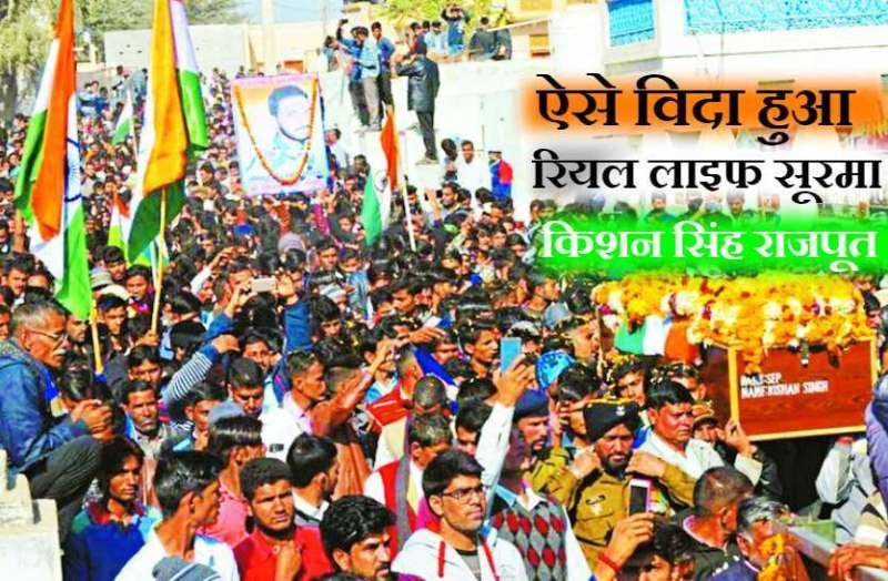 रतनगढ़ (चूरू). ऐ शहीदे मुल्को मिल्लत मैं तेरे ऊपर निसार, अब तेरी हिम्मत का चर्चा गैर की महफिल में है...। राजस्थान के चूरू जिले के रतनगढ़ शहर से करीब 13 किमी दूर सालासर रोड स्थित गांव भींचरी में सोमवार सुबह हजारों लोगों की भीड़ के साथ गांव के लाडले व शहीद किशनसिंह की देह पंचतत्व में विलीन हो गई।