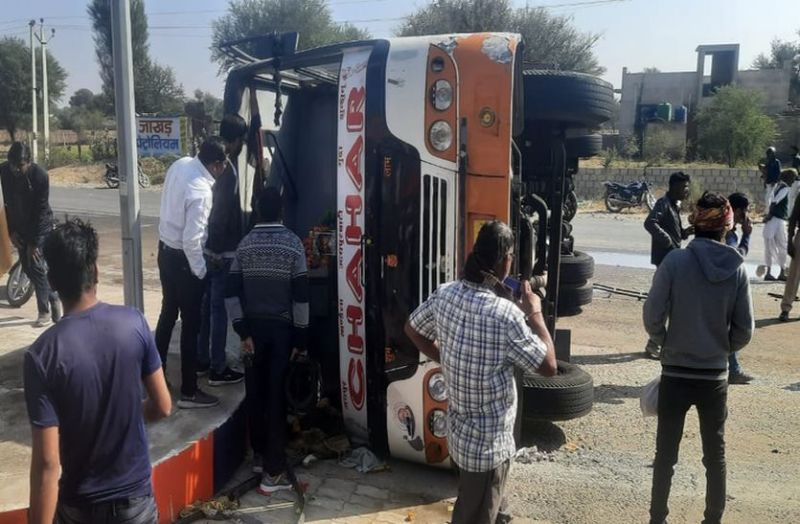 सीकर/खंडेला. राजस्थान के सीकर जिले के खंडेला कस्बे में एक तेज रफ्तार लोक परिवहन बस अनियंत्रित होकर पलट गई। (lok parivahan bus overturned in khandela, sikar) खंडेला-उदयपुरवाटी मार्ग पर कारोई बस स्टैंड के पास हुए हादसे में बस करीब 20 मीटर तक घसिटते हुए पेट्रोल पंप तक पहुंच गई। जहां वह पंप पर बने प्लेटफार्म से टकराकर रूक गई। हादसे में एक दर्जन से ज्यादा यात्री घायल हो गए। जिनमें से आठ यात्रियों की हालत गंभीर होने पर उन्हें जयपुर रेफर किया गया। थानाधिकारी घासीराम ने बताया कि मंगलवार को लोक परिवहन बस जयपुर से झुंझुनूं जा रही थी। इसी दौरान वह अनियंत्रित हो गई।