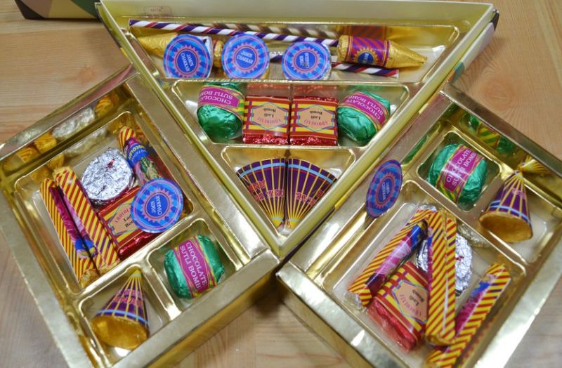 त्योहारी सीजन के लिए यह चॉकलेट्स अलग-अलग सेट और दर पर लांच की गई है। जिनकी कीमत 265 से 675 तक है। सेट में यह स्माल लक्ष्मी बम, चकरी, नागिन और हाइड्रो बम के रूप में रोज, लिची, पान और बटर स्कॉच फ्लेवर में उपलब्ध है। इसी तरह ब्लेक करंट, लिची, पान, इलायची, मिल्की सिल्की, रोस्टेड नट्स और रोज फ्लेवर के रॉकेट, चकरी, हाइड्रो बम, अनार, लड़ी बम, नागिन और स्माल लक्ष्मी बम शक्ल की चाकलेट्स का अलग सेट है। वहीं, रोकेट, चकरी, हाइड्रो बम, अनार और लड़ी बम सहित विभिन्न सेट अलग अलग फ्लेवर के साथ मुहैया है।